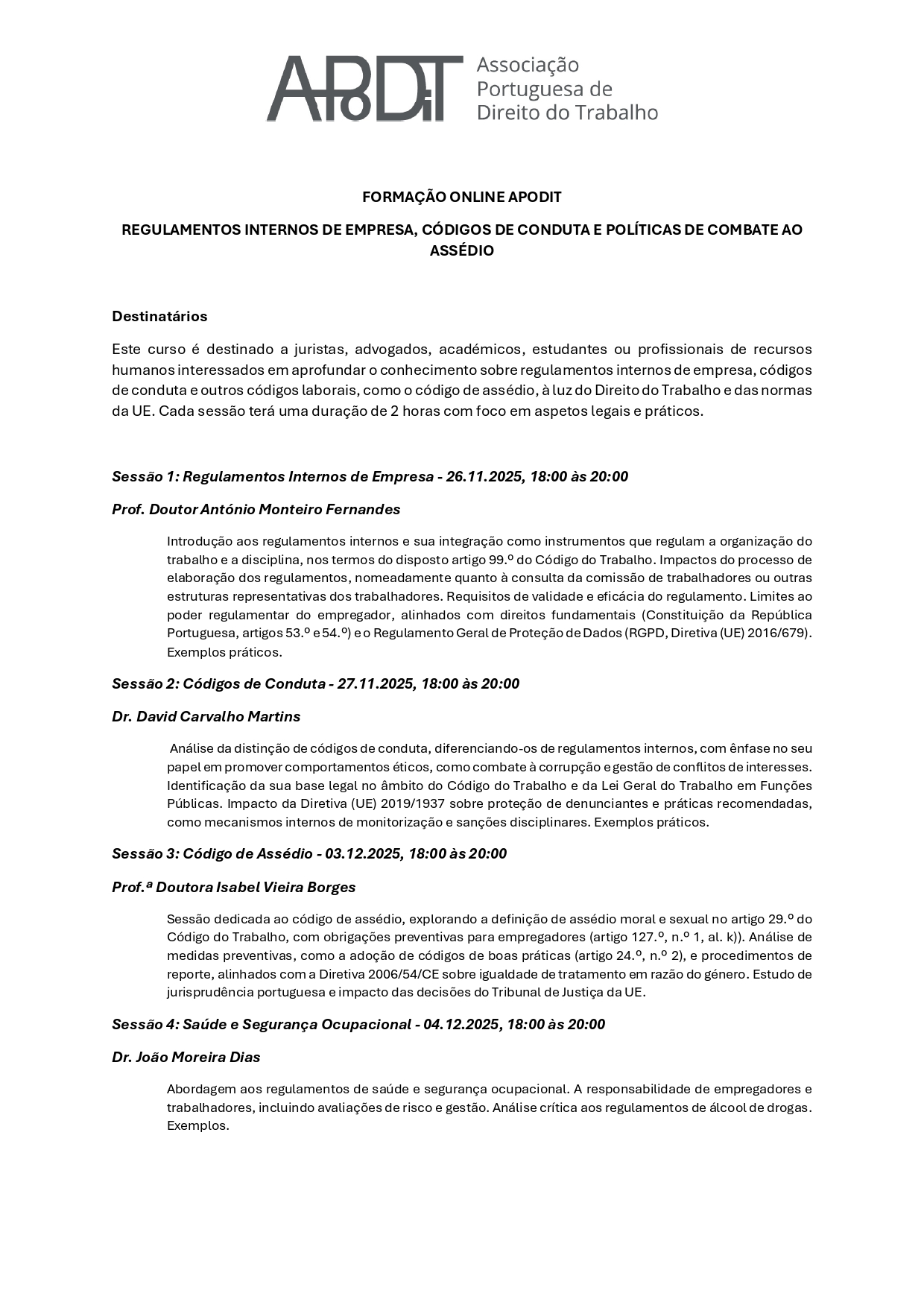 Sessões via zoom: 26 e 27 de Novembro; 3 e 4 de Dezembro de 2025