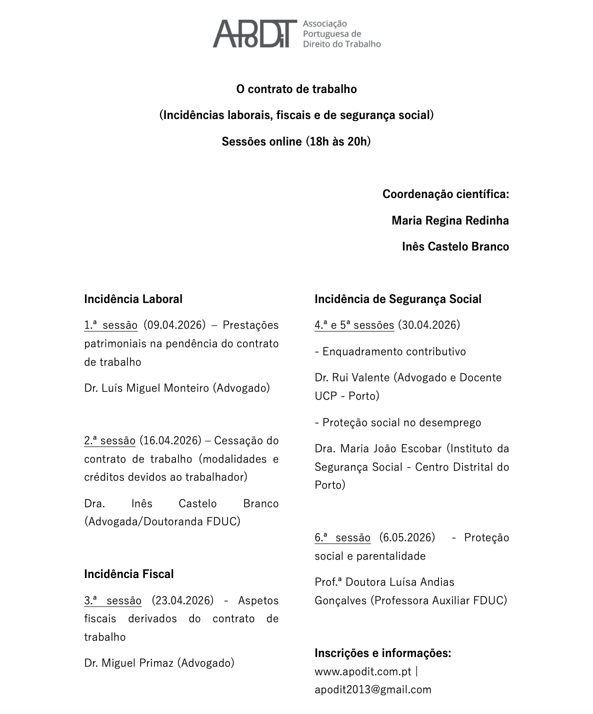 A APODIT realizará entre os dias 09 de Abril e 06 de Maio, o curso “O contrato de trabalho (Incidências laborais, fiscais e de segurança social)”.